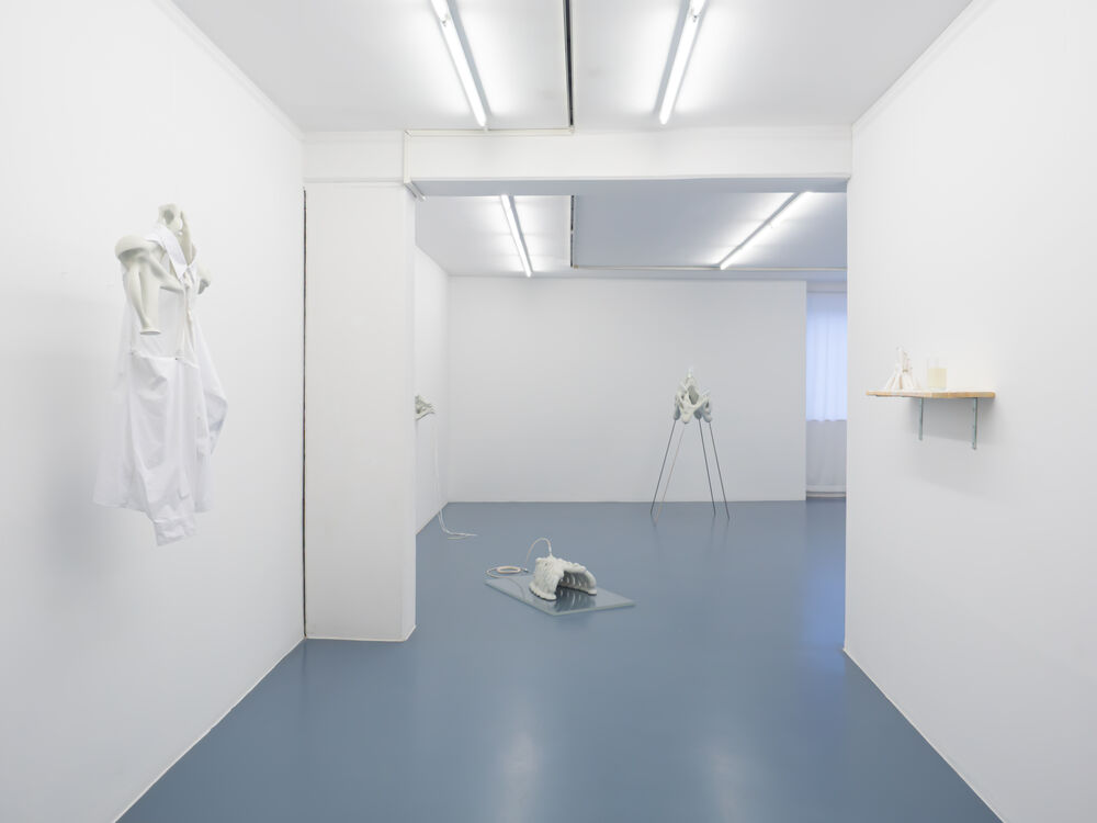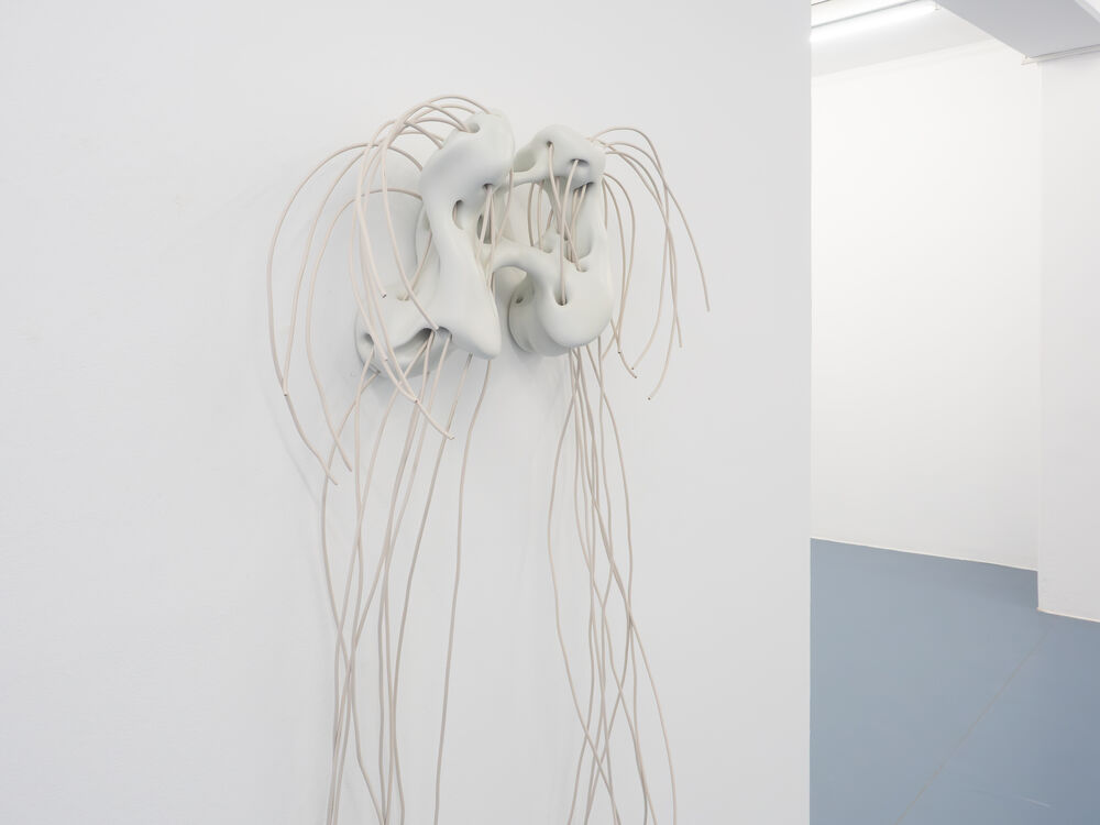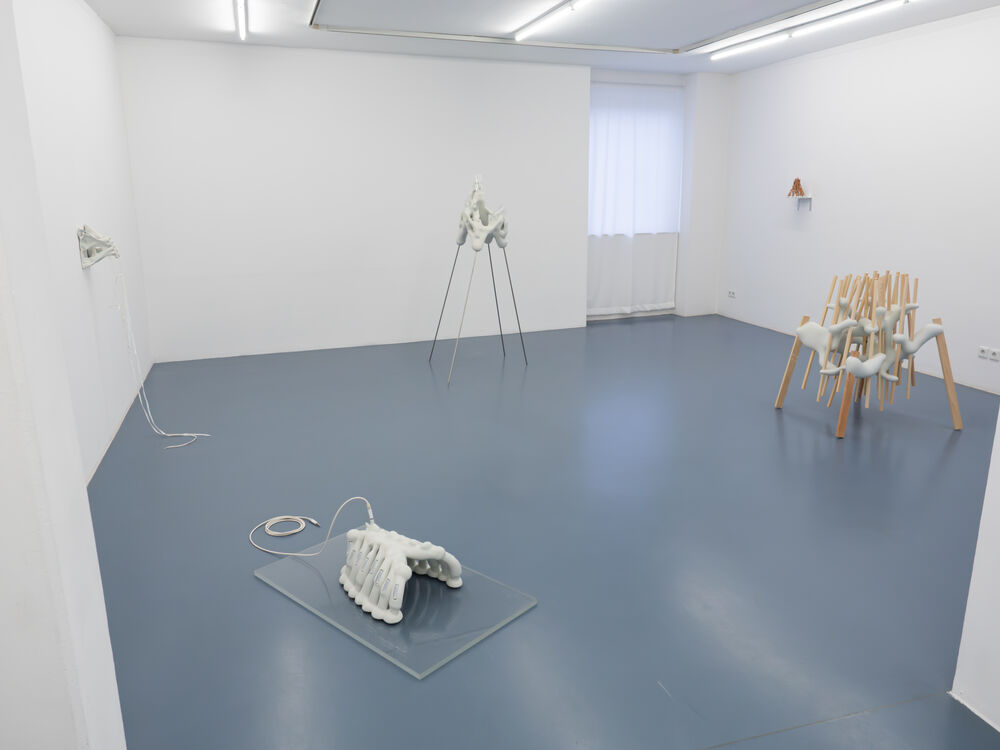Diese Kombination von mathematischen Berechnungen und künstlerischer Entscheidung hat chimärenartige, körperähnliche Formen hervorgebracht. Ihre weißlich glatten Formen erinnern an hybride Skelettteile menschlicher Körper. Die an Rippen, Schlüsselbeine oder Wirbelknochen erinnernden Plastiken sind mit Elektrokabeln, Bändern oder Batterien erweitert. Ihr technoides Erscheinungsbild stößt Fragen nach unseren Körperbildern an, nach Vorstellungen von technologischer Selbstoptimierung und den Ideen des sog. "Transhumanismus".